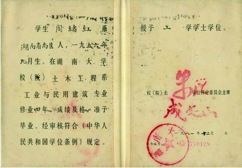 也为同学们创造了良好的学习环境,所以学习上基本没有什么困难。在学习上,同学们都互相攀比、互相激励、无形中也互相约束。我几乎很少看电影,周末也不怎么休息。晚上寝室熄灯后,还经常打手电在被子里学习看书,或到路灯下看书,老师布置的作业全做,老师没有布置的也做,还要找参考书、习题集做,一个理论力学题采用多种方法求解,个别题甚至做到了一题八解。作业本工工整整,每个图都用尺子画,做过的作业本摞起来一大叠。现在想起来,要是学生都是这样的话,老师无法有时间来批改这么多作业。我每天早起上岳麓山读英文和锻炼,连英文单词在哪一页出现我都记得住,毕业三十五年后同学聚会时还谈起这事。