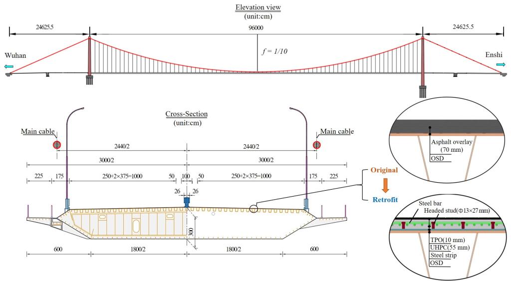 宜昌长江公路大桥是一座主跨960米的悬索桥,于2001年建成通车。大桥加劲梁为扁平钢箱梁,全宽30.0m,桥面为正交异性钢桥面板,顶板厚12mm,原沥青铺装为70mm厚SMA。自2009年起,大桥陆续出现了沥青铺装破损、钢桥面疲劳开裂等病害,桥梁检查结果表明,大桥整体状况较好,但钢桥面疲劳裂纹发展较快、新增较多,无法根治。