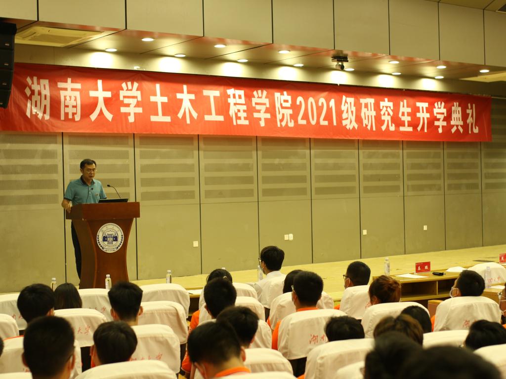 党委书记彭嘉芬向全体研究生新生表示了热烈欢迎,同时,从坚定理想信念、传承学术精神、坚守学术思想、不惧艰难险阻四个角度对同学们提出了殷切期许,希望同学们能够争做新时代土木人。