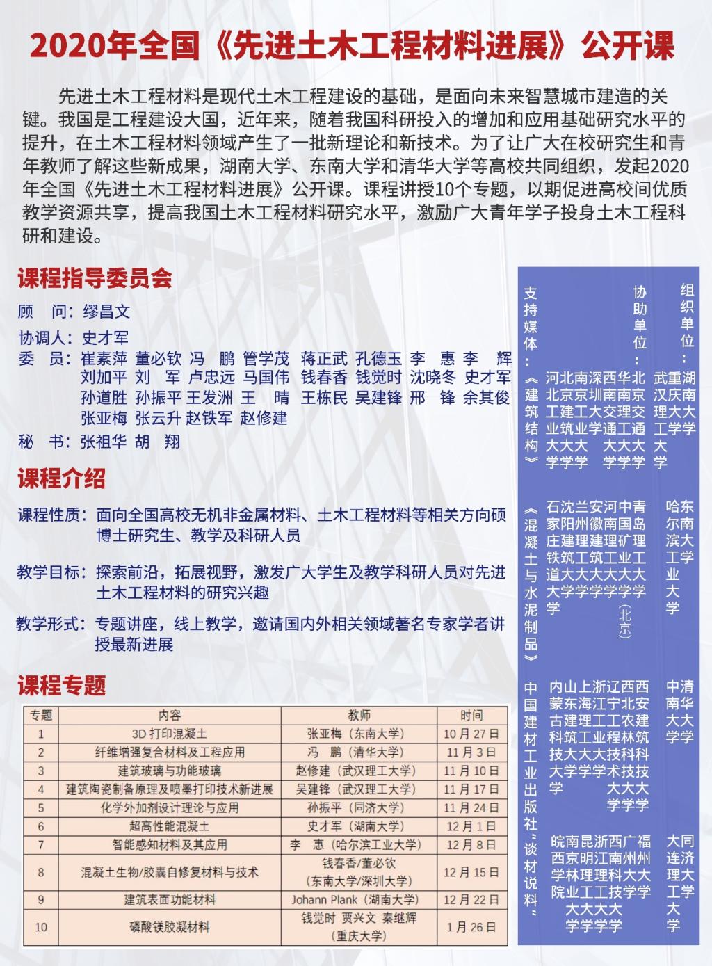 联合东南大学、清华大学、同济大学、哈尔滨工业大学、中南大学、大连理工大学、武汉理工大学等众多高校共同组织,全国三十余所高校协助举办,公开课同时也得到了《建筑结构》、《混凝土与水泥制品》、中国建筑工业出版社“谈材说料”等多家单位大力支持。公开课共邀请了十一位建筑材料与土木工程领域在国际和国内享有盛誉的大师和知名专家进行授课,授课内容涵盖了高性能水泥基材料、水泥复合材料、功能材料、绿色节能水泥基材料以及外加剂等多个研究领域,旨在向广大在校研究生和青年教师介绍土木工程材料领域的前沿理论和技术成果,激发广大学术和科研人员对土木工程材料的研究兴趣。