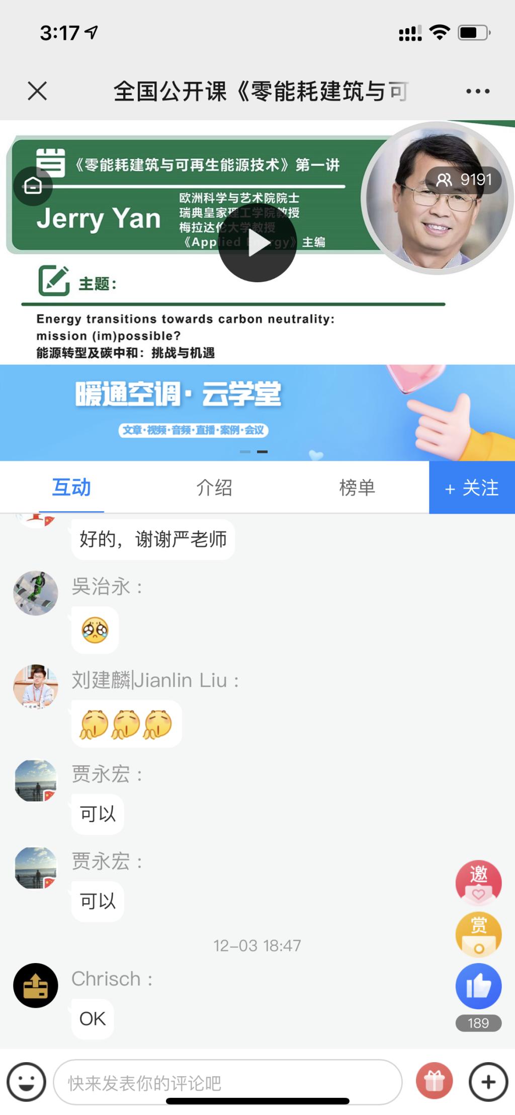 报告厅集中学习,同时还吸引了其他院校师生和企业高层管理者亲临现场参与。线上采取同步直播方式对外开放,将高品质教育资源分享给全社会。公开课直播期间,单场在线观众高达九千多人,累积在线观众超六万人次,极大的扩大了课程的受众群体。课堂气氛十分活跃,大量观众参与互动交流,加深了相关研究和技术的体会与理解,并碰撞出了新的火花,对大力发展零能耗建筑与可再生能源技术具有重要意义。课程效果超出预期,在业内收获了良好口碑,包括清华、浙大、香港理工、哈工大、同济等在内的高校学生纷纷对课程的组织形式和内容给予了高度评价。本课程的顺利举办是第一会所