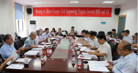 的发展历史、学科分布、师资和学生概况,并详细介绍了学科建设、人才培养、科学研究、师资队伍、国际交流、社会服务与文化传承等方面的主要工作和成绩。随后,亚利桑那大学Dominic Boccelli教授介绍了亚利桑那大学的基本情况以及土木工程专业的教学科研、学生招生及就业情况等方面的内容。随后,双方围绕联合办学的培养模式、学位授予、学科课程设置、招生人数及学费等问题进行了深入的讨论。此次会谈为两院的联合办学项目以及深入的科研合作打下了坚实的基础。