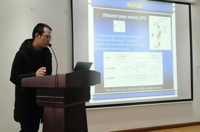 校友现工作于纽约大学阿布扎比分校的王俊杰博士重返母校,他报告了“荷载作用下混凝土的微裂纹对混凝土中氯离子传输的影响”。报告介绍了氯盐引起的钢筋锈蚀是钢筋混凝土耐久性的一个非常重要的问题。而荷载的作用容易引起混凝土的开裂,从而可能加剧氯离子在混凝土中的渗透。虽然宏观裂纹普遍被认为是混凝土耐久性危险的一个信号,但是微裂纹可能没能引起足够的重视。
