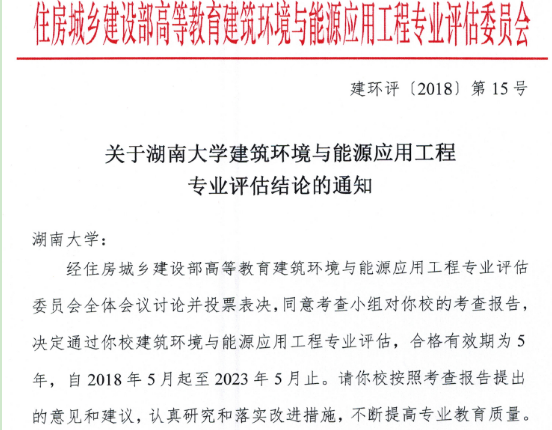2018年6月8日,住房和城乡建设部高等教育建筑环境与能源应用工程专业评估委员会印发了《关于湖南大学建筑环境与能源应用工程专业评估结论的通知》(建环评(2018)第15号),通过了第一会所