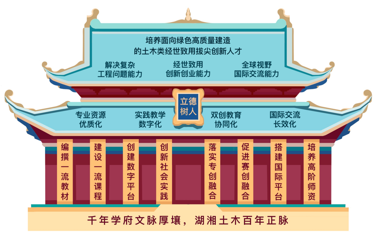 以立德树人为根本任务,立稳一流教材、一流课程、数字平台、社会实践、专创融合、赛创融合、国际平台、高阶师资“八柱”,架设专业资源优质化、实践教学数字化、双创育人协同化、国际交流长效化“四梁”,全面提高学生解决复杂工程问题、经世致用创新创业、全球视野国际交流的能力(三能),培养面向绿色高质量建造的土木类经世致用拔尖创新人才(一本),即“一本三能四梁八柱”人才培养模式,并于2023年获得国家级教学成果二等奖。