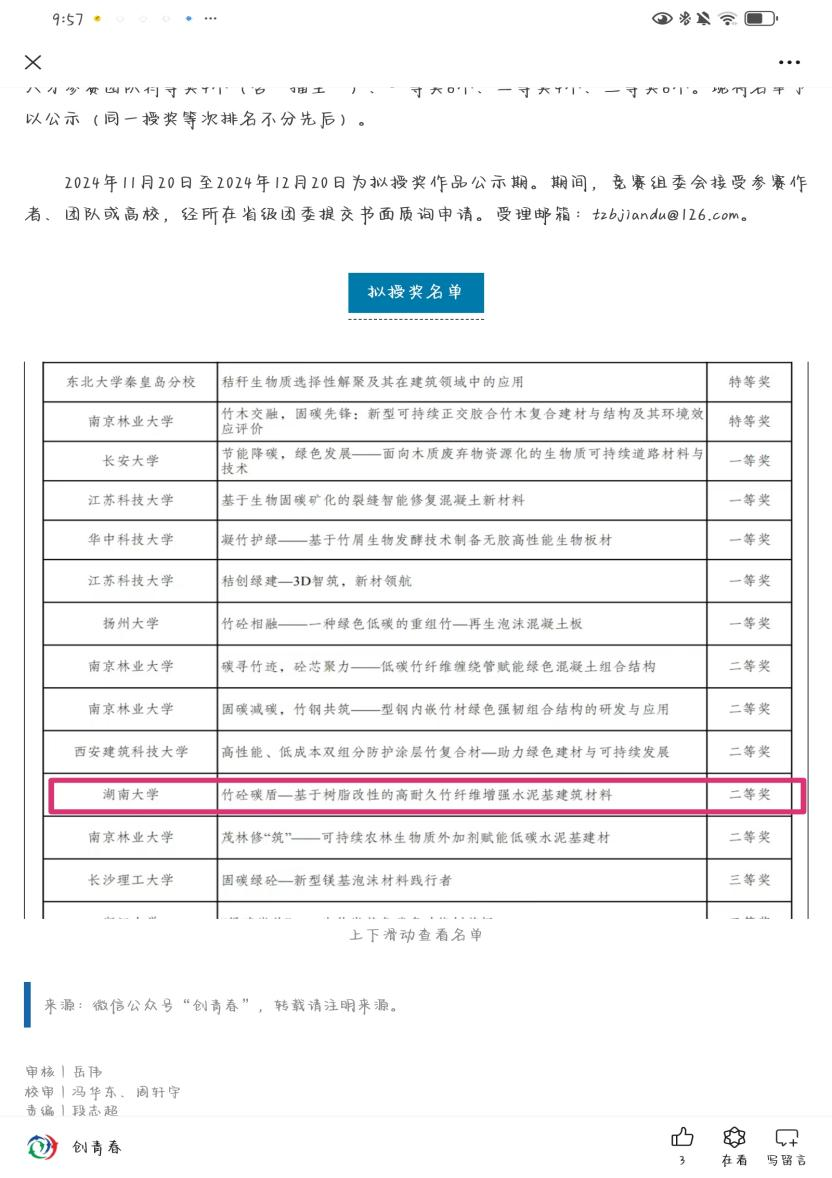 郭帅成、史才军、朱德举老师指导,杨童斐作为学生负责人的项目“竹砼碳盾—基于树脂改性的高耐久竹纤维增强水泥基建筑材料”获得二等奖。