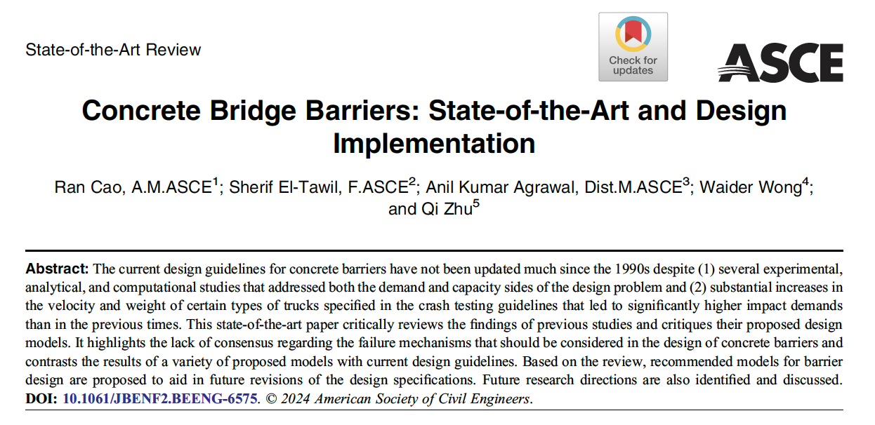 为第一作者单位。论文系统梳理了混凝土防撞护栏在实验研究、理论分析与数值模拟等方面的发展现状,深入剖析了现行设计模型的局限性,并提出了具有实践指导意义的改进建议。该研究成果为美国现行AASHTO-LRFD桥梁防撞护栏设计规范的修订提供了关键理论支撑,同时也为我国相关标准的更新完善提供了重要参考。
