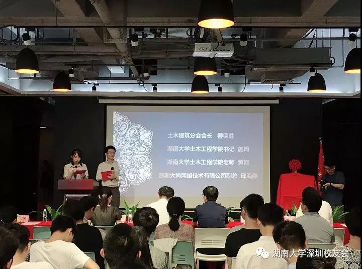 土木建筑分会一直以来所取得的成绩,两位老师带来了母校的关怀,并对2018届的毕业生们寄予了无限的希望。随后,为本次盛会筹办给予大力支持的的校友企业深圳大尚网络技术有限公司董事长,东道主乐铁毅校友致辞,并为大尚网络技有限公司举行了深圳市第一会所