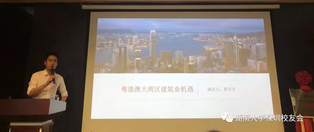00级土木工程专业晏平宇校友代表施工单位分享关于我国建筑业的现状,并介绍了粤港澳大湾区的发展优势,揭示建筑业的新机遇,并激励新生们要立足现状,拥抱风口,追逐理想。