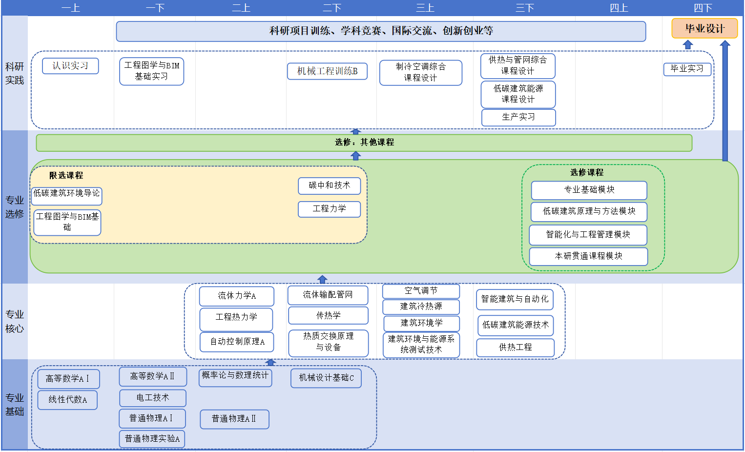 2. 学科知识:具备扎实的数学及自然科学的基础知识,掌握宽厚的建筑环境与能源应用工程设计、施工、运维、工程管理与设备研发等专业知识。 |