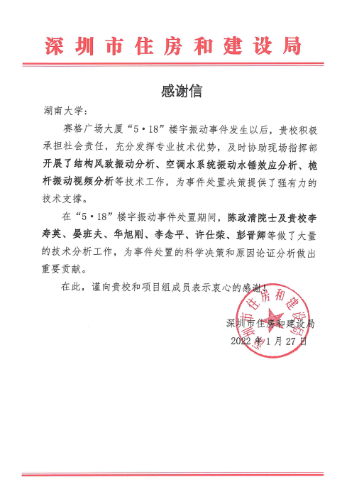 发来感谢信,对陈政清院士及李寿英、晏班夫、华旭刚、李念平、许仕荣、彭晋卿等教授团队在赛格广场大厦“5·18”楼宇振动事件分析工作中做出的重要贡献表示感谢。