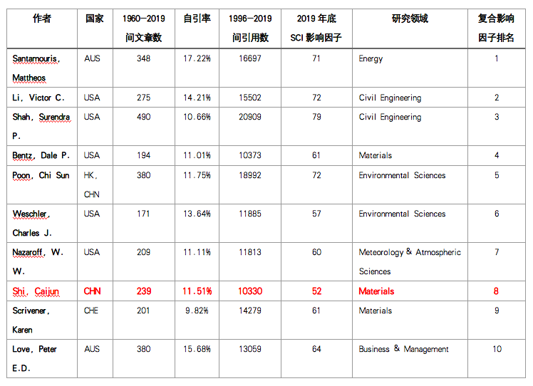 史才军教授入选前10名科学家榜单,复合影响因子排名全球第8。建设与建造领域榜单综合考虑土木工程、材料、能源和环境工程等相关研究领域1996-2019间文章引用数量、2019年影响SCI影响因子以及论文的自引率,对全球相关的研究学者的学术影响力进行了统计。史才军教授以超高的引用次数(10330)和SCI影响因子(52)以及较低的自引率(11.51%)排名建设与建造领域材料方向全球科学家第二位,也是中国大陆地区唯一上榜的科学家。同时,史才军教授在2019年度全球建设与建造领域影响力排名中位列全球第4。