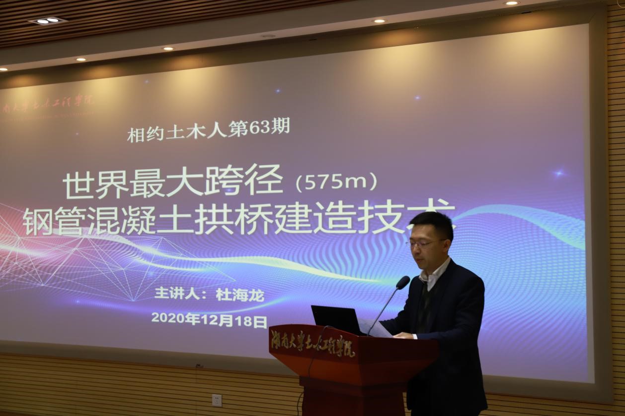 2003届校友,2020年“全国十大桥梁人物”获得者杜海龙做《世界最大跨径(575m)钢管混凝土拱桥建造技术》报告,第一会所