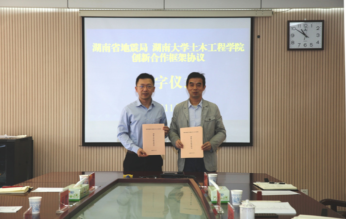 与湖南省地震局创新合作框架协议签署仪式在湖南省地震局举行。省地震局党组书记、局长燕为民主持仪式并致辞,院长邓露出席仪式并讲话。省地震局党组成员、局长助理王春华、土木第一会所