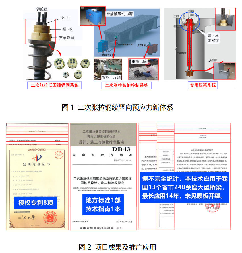 预应力混凝土箱梁桥在我国应用十分广泛,但其腹板开裂现象十分严重,造成重大安全隐患,属于世界性难题,腹板开裂的主要原因是有效竖向预应力不足。为解决上述难题,项目组自2002年起,通过新型锚具研发、室内模型试验、理论与数值分析、现场测试反馈、标准化研究等手段,形成了二次张拉钢绞线高效竖向预应力新体系,取得了一系列创新性成果:(1)首次研发成功二次张拉钢绞线高效竖向预应力体系,填补了钢绞线短索锚固体系的空白,大幅度提高了预应力效率和工程质量,显著降低了箱梁腹板开裂的风险;(2)发明了短索二次张拉智能控制系统,实现了张拉效果可测可控,确保张拉质量的稳定;研制了专用的压浆系统,确保竖向预应力管道压浆饱满密实,提高了耐久性;(3)首次提出了二次张拉的预应力损失计算理论及相应的腹板竖向预应力设计方法,为新预应力体系的工程应用奠定了坚实的理论基础。
