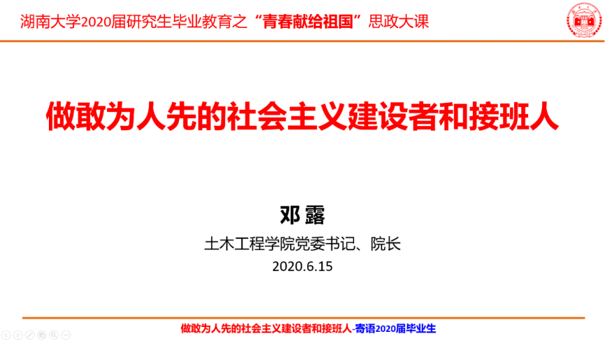 党委书记、院长邓露教授为2020届毕业研究生讲授题为《做敢为人先的社会主义建设者和接班人》线上思政课。党委副书记秦鹏、全体辅导员参与听课。