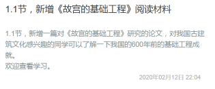 · 对建筑历史有兴趣的同学,增加了《故宫的基础工程》的阅读材料。