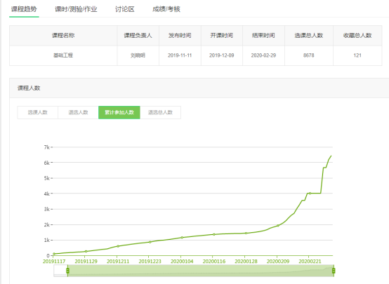 在原定各大学的2月15日开学后,课程网站访问量激增,课程结课时选课人数超过6000人;课程结课后,选课人数仍在持续增加,到3月25日,选课人数达8636人,远超同网站其他同类课程。