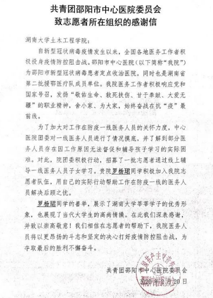 。2018级岩土班研究生罗杨珺在接受采访时说,“我的朋友是邵阳市中心医院的护士,她得知医院有志愿给一线医务人员子女辅导活动后马上告诉了我,商量了几分钟,就让她替我报名了。不会救死扶伤,也帮不上什么大忙,我只是第一会所