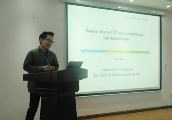 香港理工大学的俞可权博士报告了“超高性能应变硬化水泥基材料的开发及其在结构中的应用”。该报告介绍了超高性能应变硬化水泥基材料(UHP-ECC)结合了超高性能混凝土UHPC与应变硬化水泥基材料的特点,采用废弃资源颗粒、功能性材料以及纳米材料从多尺度的角度修饰UHP-ECC,得到改性后UHP-ECC材料。将UHP-ECC应用于梁、柱构件,制作无钢筋增强的结构构件,其与传统钢筋混凝土梁柱具有相似的承载力性能。在结构层次,制作无筋框架,历经强震后显示出更为优异的抗震性能。
