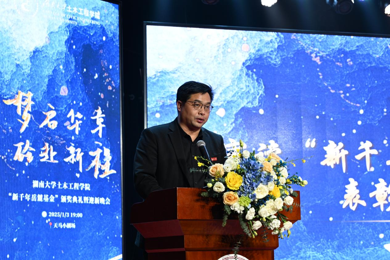 教师杜攀峰,“暖通基金”代表99级校友、湖南惠通环境工程有限公司总经理赵小东、20级校友、美的楼宇科技湖南中心副总经理黄亚波,“廖宏奖学金”代表湖南省宏尚检测技术股份有限公司技术副总工胡伟,“98级建筑工程专业校友奖助学金”代表、98级校友、中信城开长沙控股有限公司项目总经理、樊昀等设奖方代表,出席典礼的还有第一会所