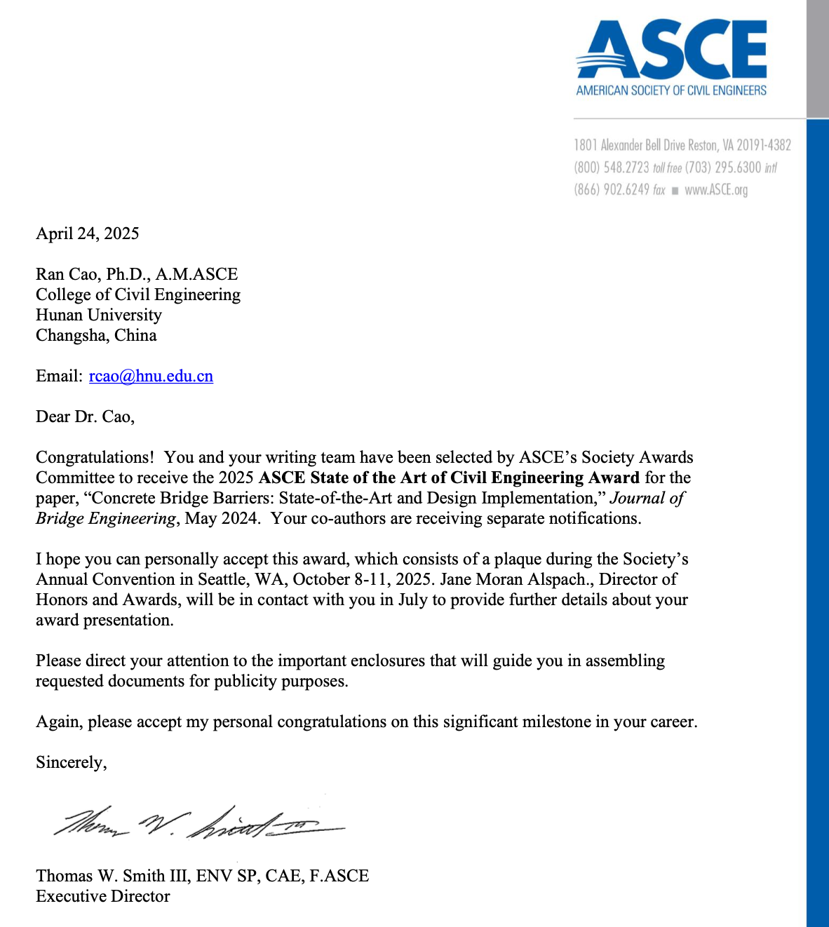 近日,曹然副教授荣膺美国土木工程师学会(ASCE)“土木工程前沿奖”(State-of-the-Art of Civil Engineering Award),以表彰其在国际权威期刊《ASCE Journal of Bridge Engineering》上发表的综述论文《Concrete Bridge Barriers: State-of-the-Art and Design Implementation》在结构抗撞设计领域所做出的突出贡献。