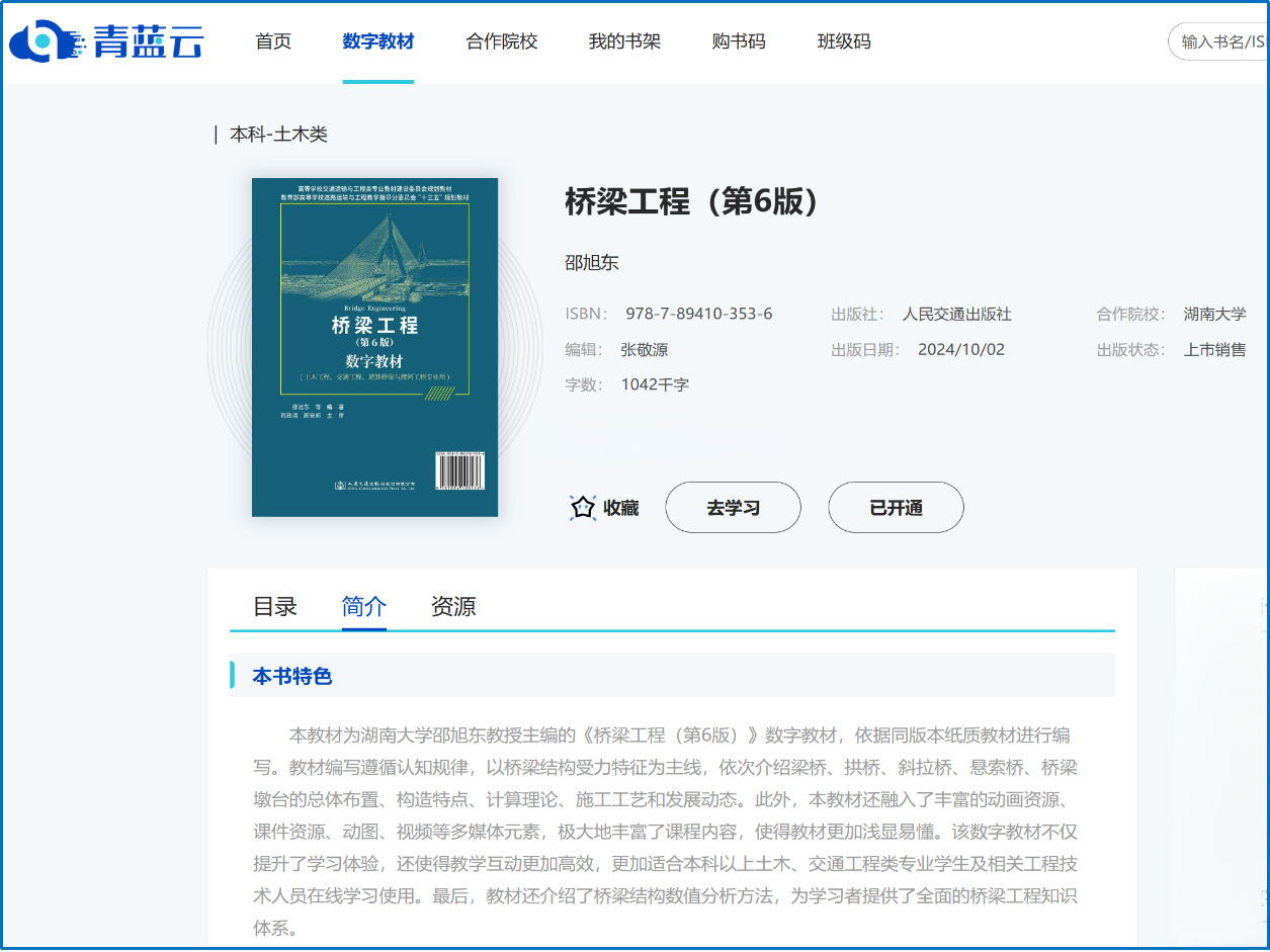 《桥梁工程(第6版)》数字教材,由人民交通出版社出版。该数字教材于2024年10月在“青蓝云”数字教材平台上线,是我国桥梁工程领域首部数字教材。第一会所
