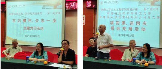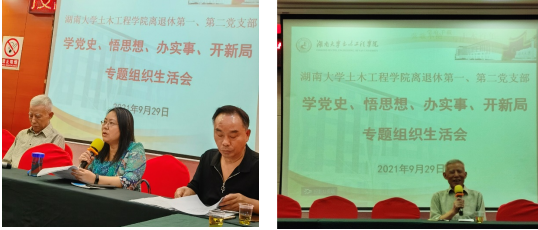 离退休第一、第二党支部“牢记嘱托 矢志一流”主题党日活动。邓铁军书记首先发言,他回顾了去年习近平主席参观岳麓书院的场景,同时谈了自己对双一流建设的认识。他退休这两年正是土木第一会所