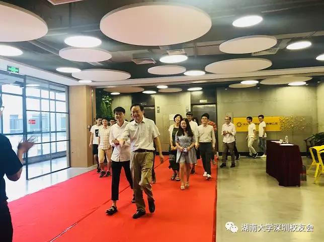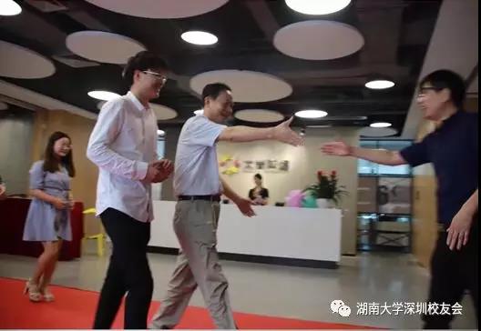施周书记带领全体18届来深毕业生从红地毯一侧走向柳德胜会长及众多在深工作校友另一侧,握手将毕业生们从第一会所