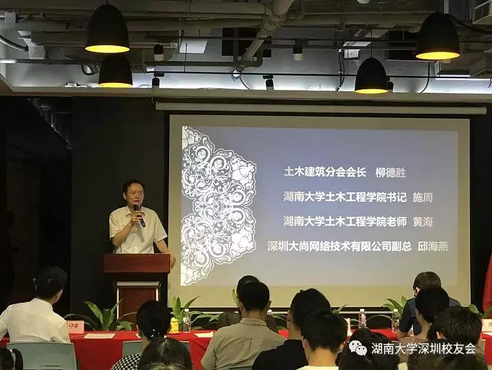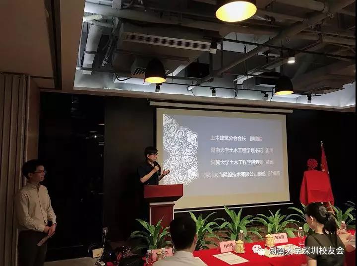 土木建筑分会一直以来所取得的成绩,两位老师带来了母校的关怀,并对2018届的毕业生们寄予了无限的希望。随后,为本次盛会筹办给予大力支持的的校友企业深圳大尚网络技术有限公司董事长,东道主乐铁毅校友致辞,并为大尚网络技有限公司举行了深圳市第一会所