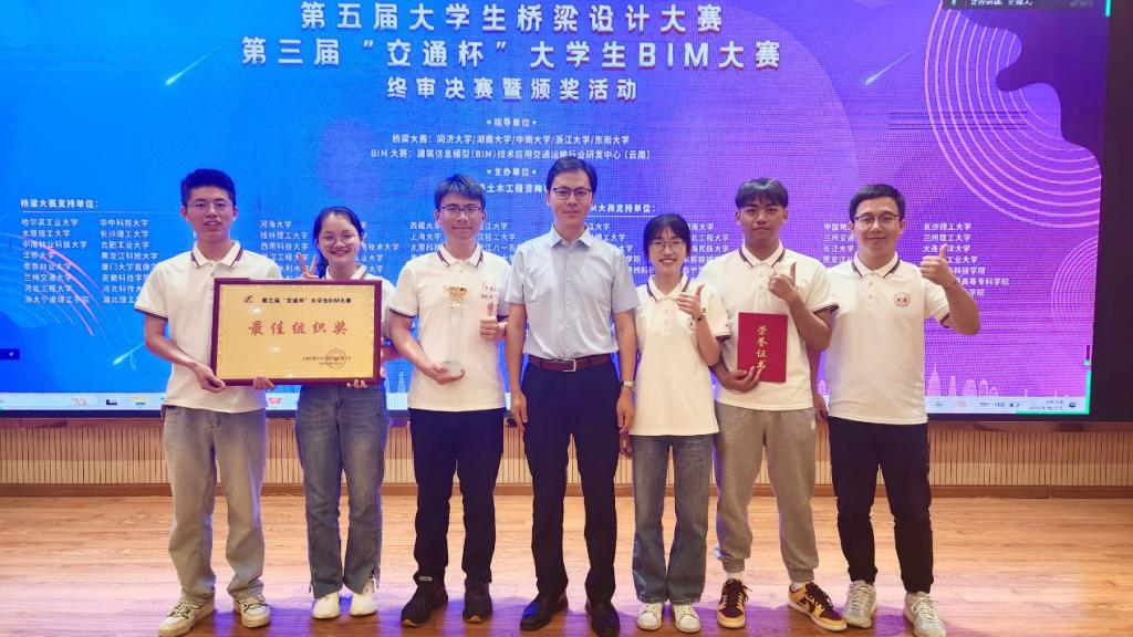 参赛队伍由道路与交通工程系张恒龙教授、杜攀峰助理教授作为指导老师,本科生李佳成、冯俊儒、何淳婉、陈卓、郑慧婕和成子龙同学作为成员,成功入围BIM大赛公路工程赛道决赛,与其他17支队伍展开角逐。